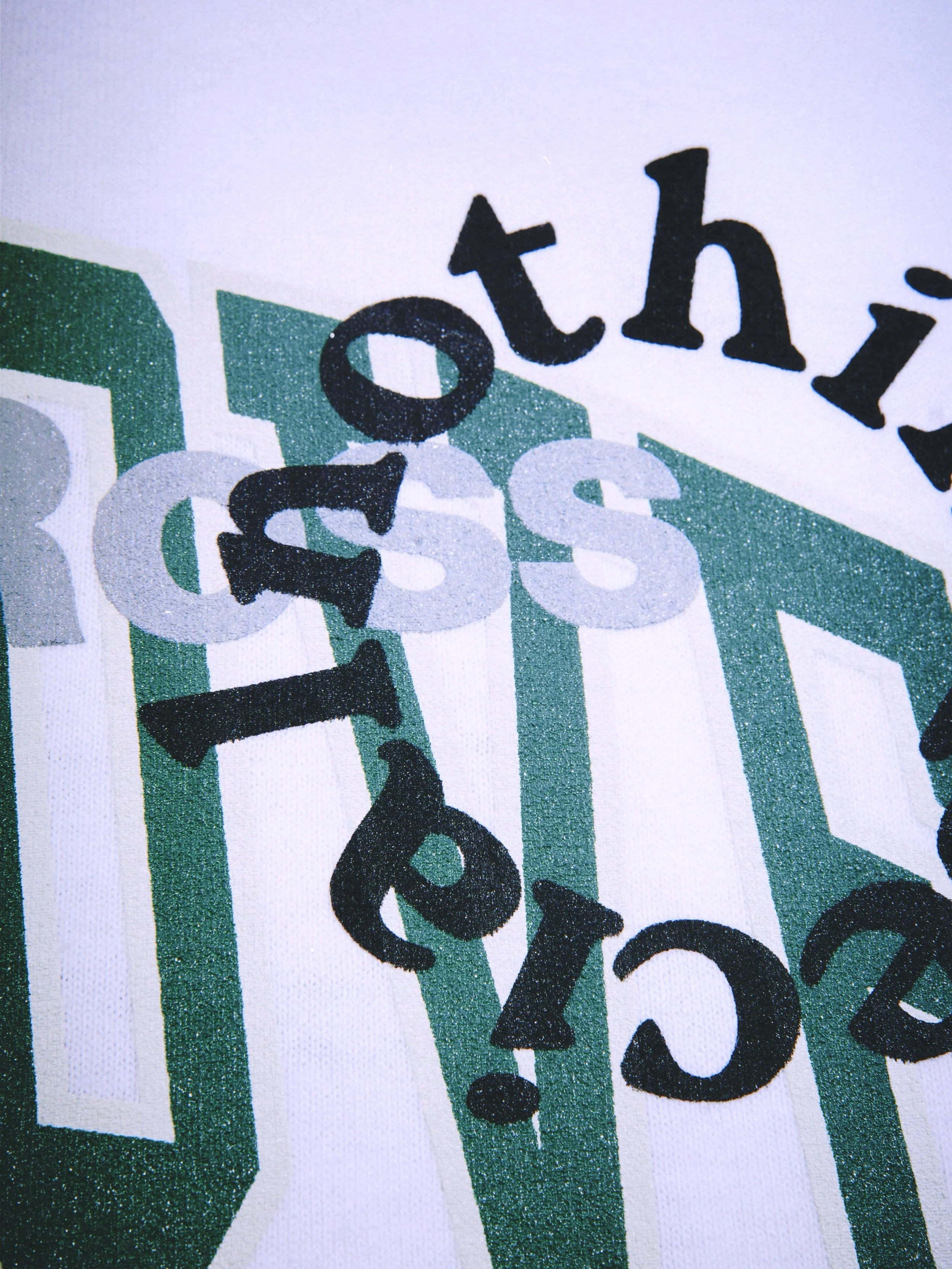 Close-up of a graphic design featuring text arranged vertically and horizontally with a green, white, and black color scheme.